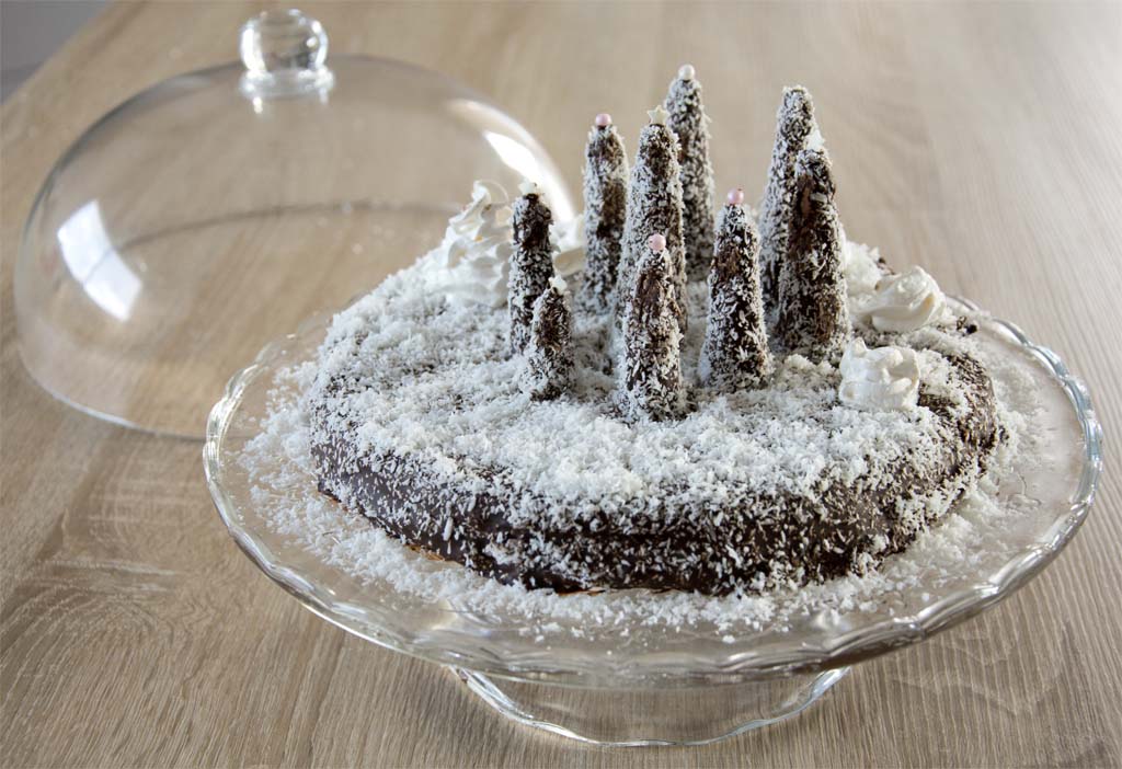 Mais comme vous me connaissez, vous savez bien que la tradition, les recettes, toussa, moi, j’y rajoute toujours mon grain de sel, donc ma bûche aux marrons s’est transformée en un gâteau comme une forêt de sapins enneigés.